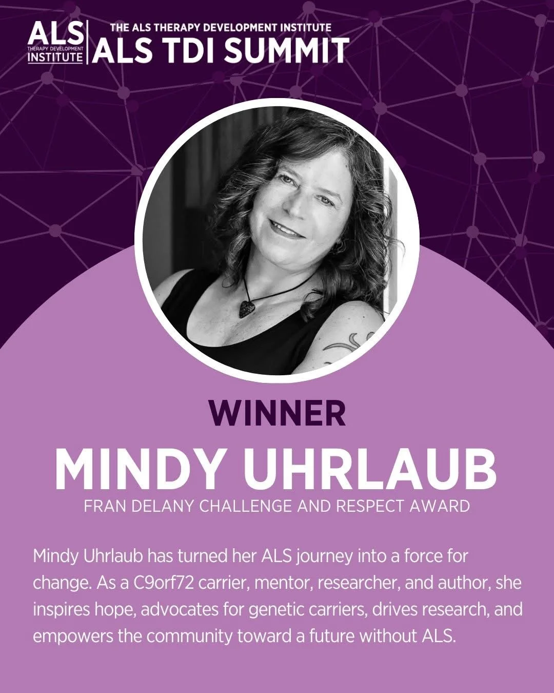 Mindy Uhrlaub is a carrier of the fatal C9orf72 gene and is an activist for genetic carriers of ALS. She is a member of the Peer Mentor Team at I AM ALS, a founding member of Genetic ALS/FTD: End the Legacy, and participates in more than a dozen longitudinal studies of ALS. She is also the author of the forthcoming book, Last Nerve: A Memoir or Illness and the Endurance of Family. Uhrlaub has testified before the National Institutes for Health and the Food and Drug Administration, demanding early access to life-saving drugs for presymptomatic carriers of genetic ALS. She is enrolled in longitudinal research to study how a presymptomatic carrier of C9orf72 ALS responds to an ALS drug.